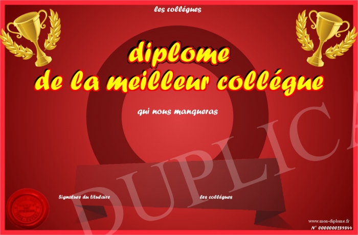 Envoyez par email votre diplome de la meilleur collégue personalisé