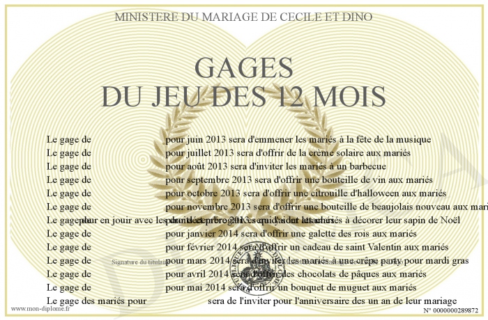 Envoyez par email votre Gages du jeu des 12 mois personalisé
