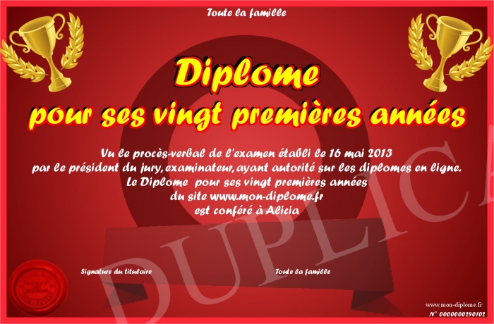 Envoyez par email votre Diplôme pour ses vingt premières années personalisé