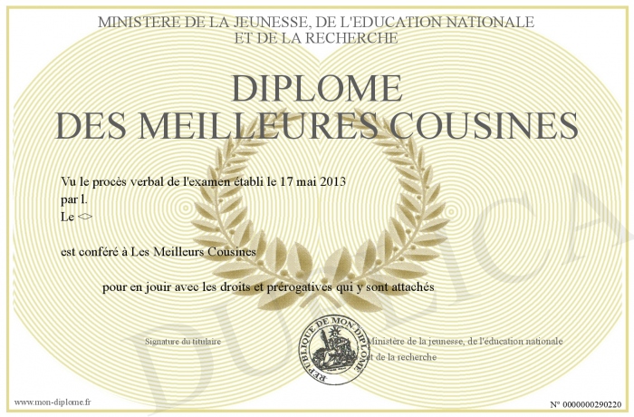 Envoyez par email votre Diplôme des meilleures cousines personalisé