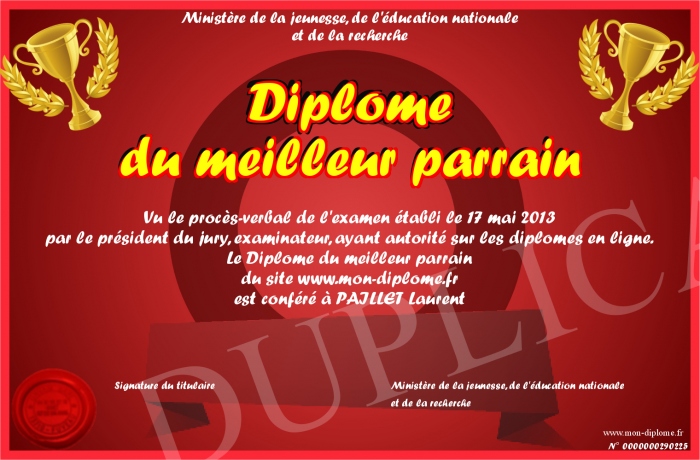 Envoyez par email votre Diplome du meilleur parrain personalisé