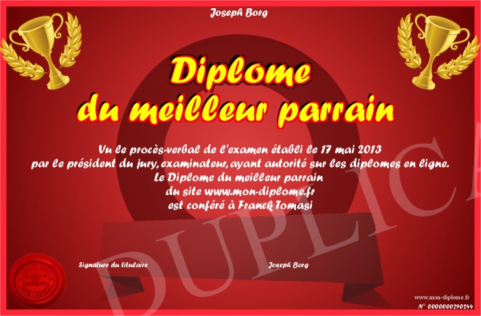 Envoyez par email votre Diplôme du meilleur parrain personalisé
