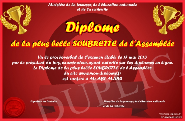 Envoyez par email votre Diplôme de la plus belle SOUBRETTE de l'Assemblée personalisé