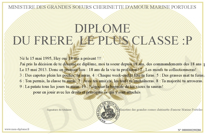 Envoyez par email votre Diplôme du frère le plus classe :p personalisé