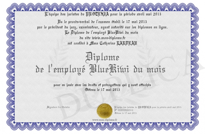 Envoyez par email votre Diplôme de l'employé BlueKiwi du mois personalisé