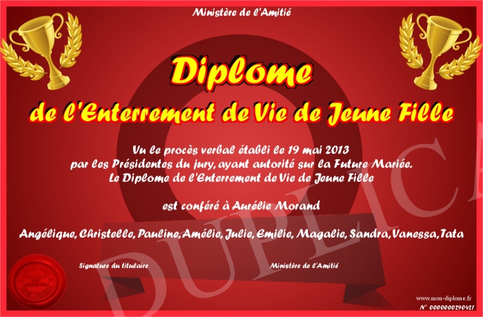 Envoyez par email votre Diplôme de l'Enterrement de Vie de Jeune Fille personalisé