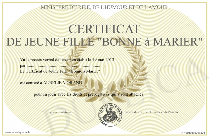 Envoyez par email votre Certificat de Jeune Fille -Bonne à Marier- personalisé