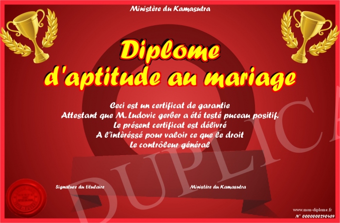 Envoyez par email votre Diplome d'aptitude au mariage personalisé