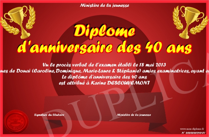 Envoyez par email votre Diplôme d'anniversaire des 40 ans personalisé