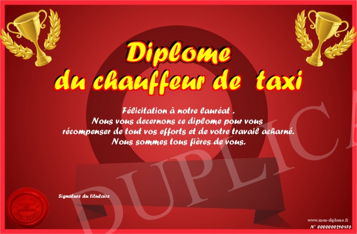 Envoyez par email votre Diplôme du chauffeur de taxi personalisé