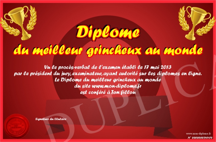 Envoyez par email votre Diplôme du meilleur grincheux au monde personalisé