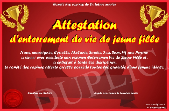Envoyez par email votre Attestation d'enterrement de vie de jeune fille personalisé