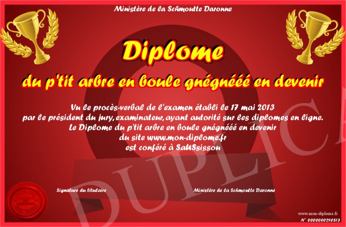Envoyez par email votre Diplôme du p'tit arbre en boule gnégnééé en devenir personalisé