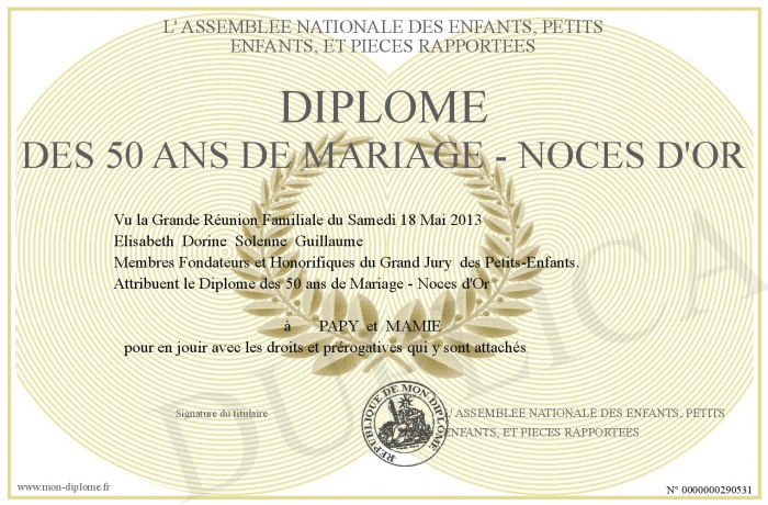 Envoyez par email votre Diplôme des 50 ans de Mariage - Noces d'Or personalisé