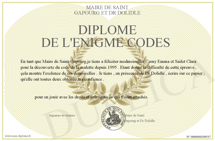 Envoyez par email votre diplome de l'énigme codés personalisé