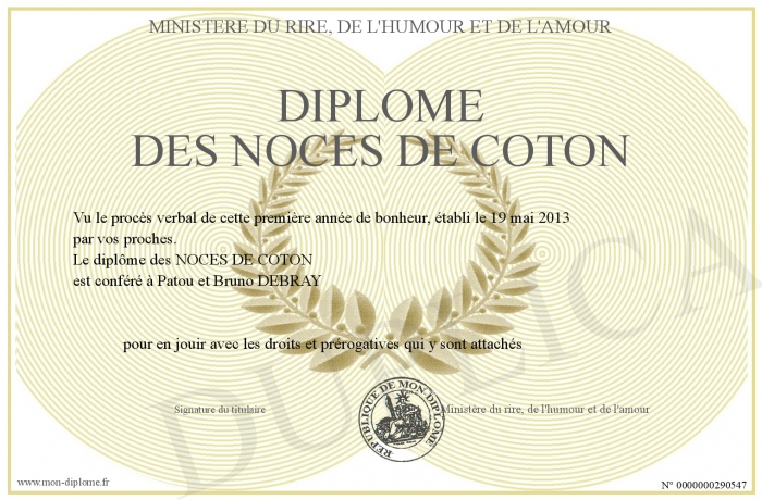 Envoyez par email votre Diplôme des noces de coton personalisé