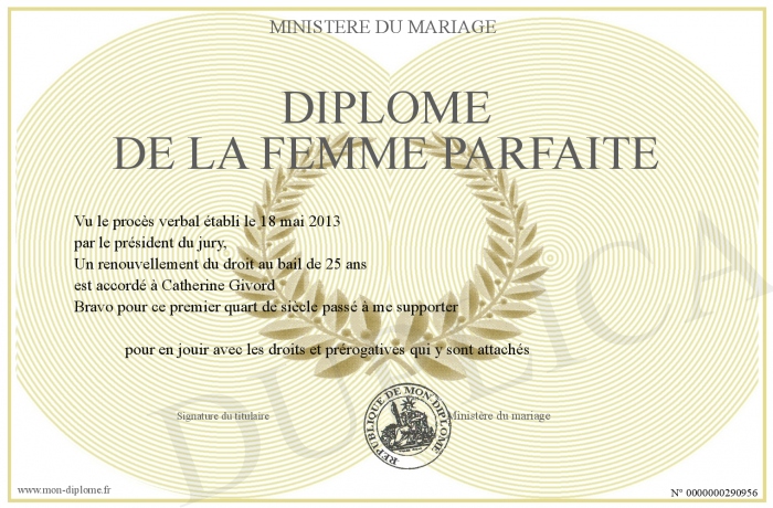 Envoyez par email votre Diplôme de la Femme Parfaite personalisé