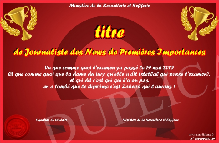 Envoyez par email votre titre de Journaliste des News de Premières Importances personalisé