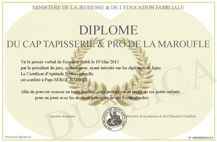 Envoyez par email votre Diplôme du CAP Tapisserie & Pro de la Maroufle personalisé