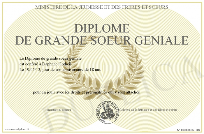Envoyez par email votre Diplôme de grande soeur géniale personalisé