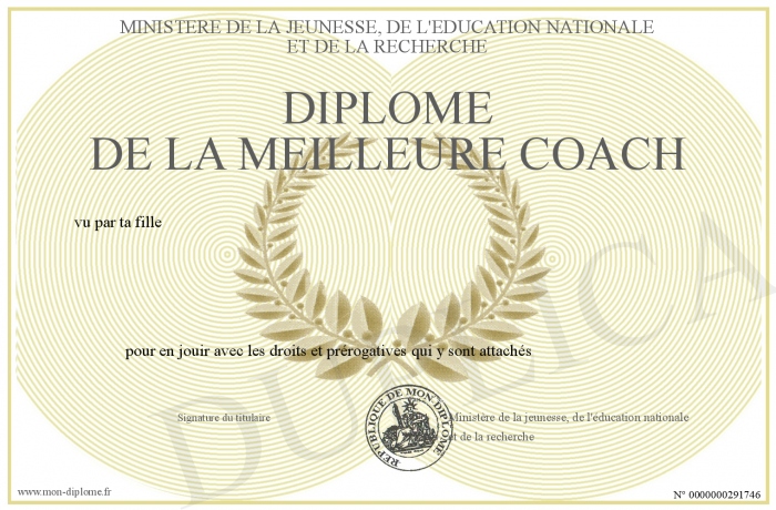 Envoyez par email votre Diplôme de la meilleure coach personalisé