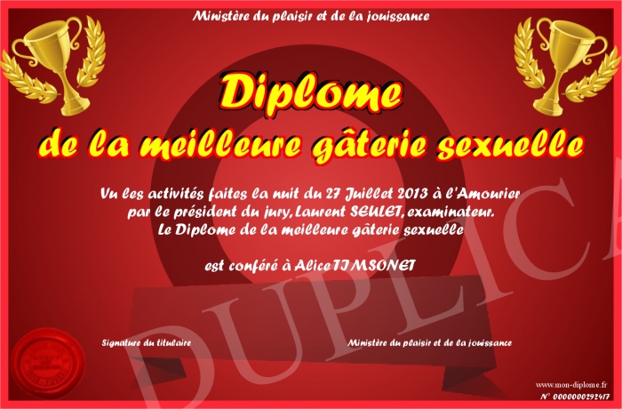Envoyez par email votre Diplôme de la meilleure gâterie sexuelle personalisé