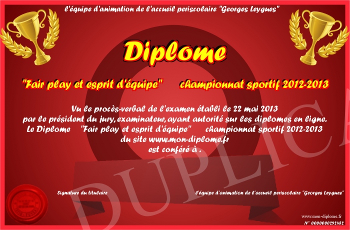 Envoyez par email votre Diplôme -Fair play et esprit d'équipe- championnat sportif 2012-2013 personalisé