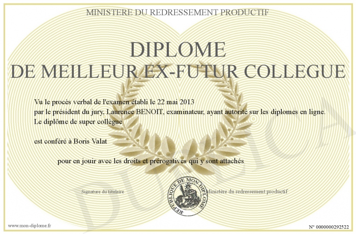 Envoyez par email votre Diplôme de meilleur ex-futur collègue personalisé