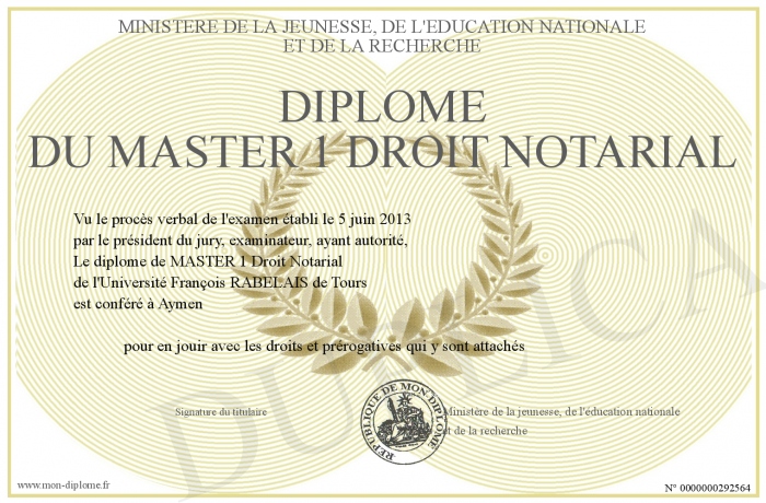 Envoyez par email votre Diplôme du MASTER 1 Droit Notarial personalisé