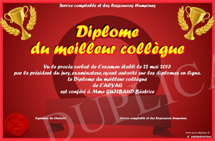 Envoyez par email votre Diplome du meilleur collègue personalisé