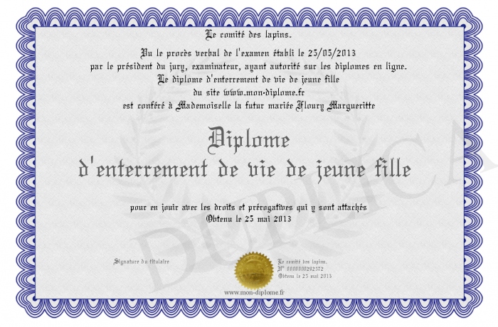 Envoyez par email votre Diplôme d'enterrement de vie de jeune fille personalisé