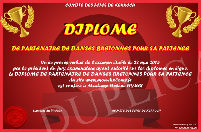 Envoyez par email votre DIPLOME DE PARTENAIRE DE DANSES BRETONNES POUR SA PATIENCE personalisé