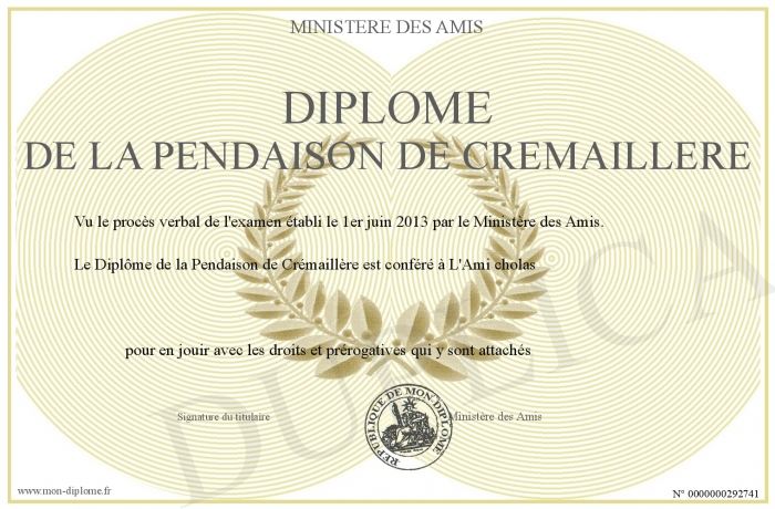 Envoyez par email votre Diplôme de la pendaison de crémaillère personalisé