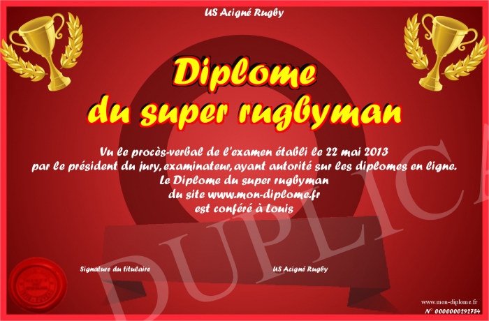 Envoyez par email votre Diplôme du super rugbyman personalisé
