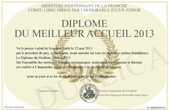 Envoyez par email votre Diplôme du Meilleur Accueil 2013 personalisé