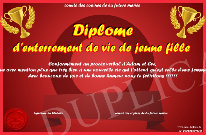 Envoyez par email votre Diplôme d'enterrement de vie de jeune fille personalisé