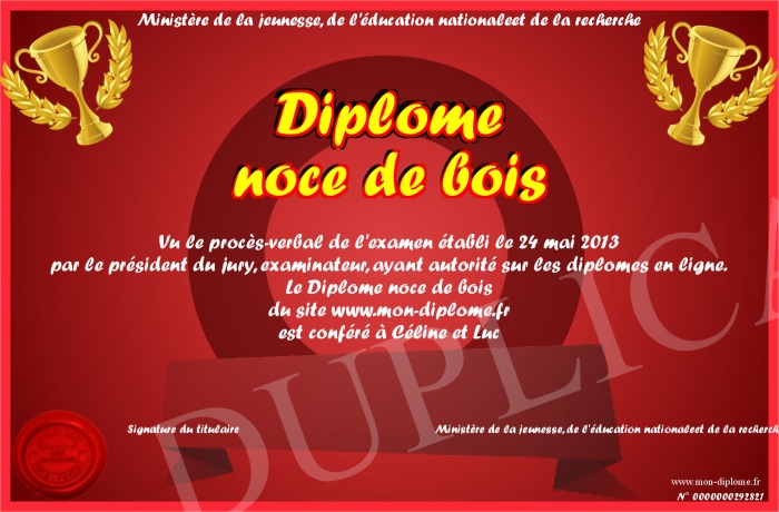 Envoyez par email votre Diplôme noce de bois personalisé