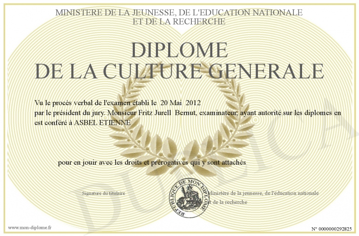 Envoyez par email votre Diplôme De la Culture Generale personalisé