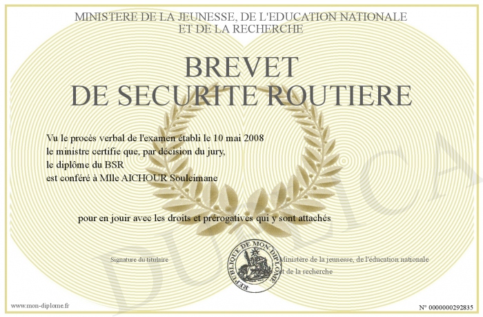 Envoyez par email votre Brevet de Securité Routière personalisé