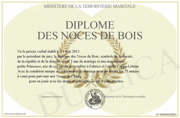 Envoyez par email votre Diplôme des Noces de Bois personalisé