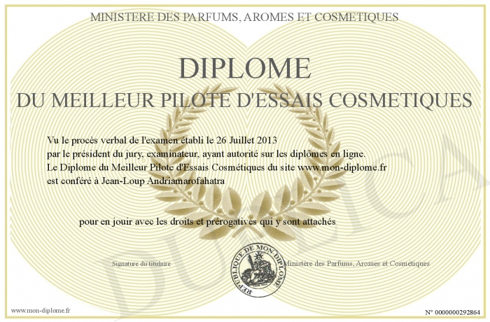 Envoyez par email votre Diplôme du Meilleur Pilote d'Essais Cosmétiques personalisé