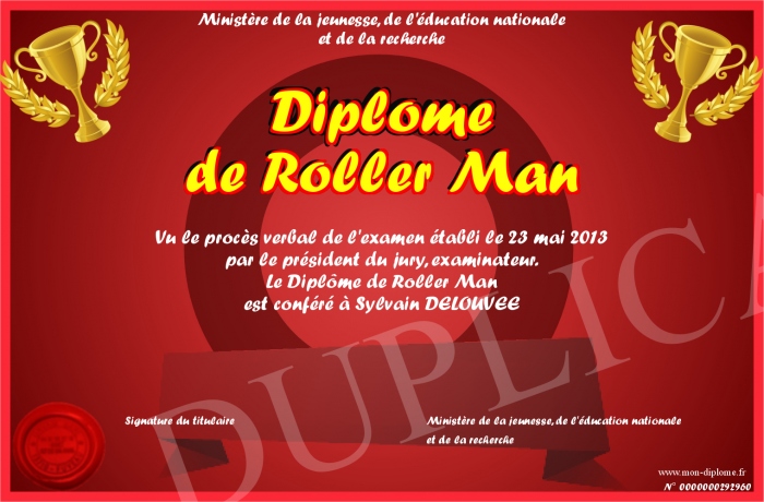 Envoyez par email votre Diplôme de Roller Man personalisé