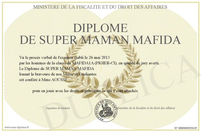 Envoyez par email votre Diplôme de SUPER MAMAN MAFIDA personalisé