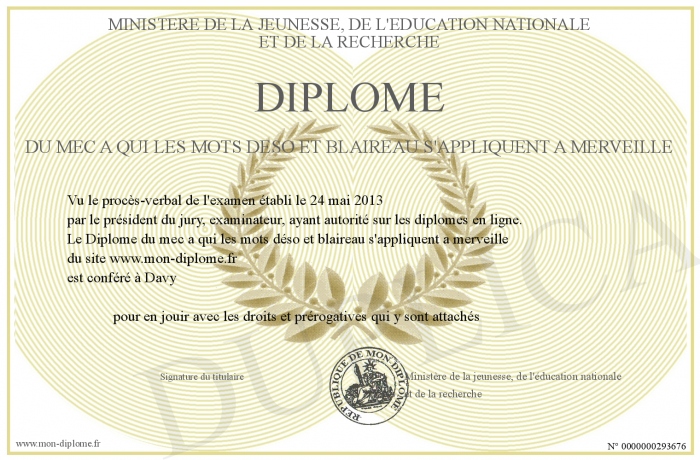 Envoyez par email votre Diplôme du mec a qui les mots déso et blaireau s'appliquent a merveille personalisé