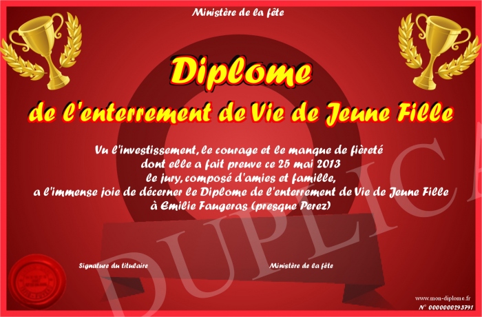 Envoyez par email votre Diplôme de l'enterrement de Vie de Jeune Fille personalisé