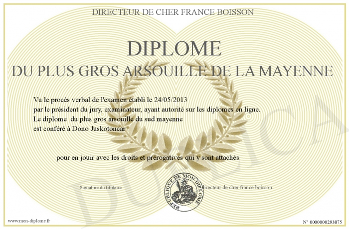 Envoyez par email votre Diplôme du plus gros arsouille de la mayenne personalisé