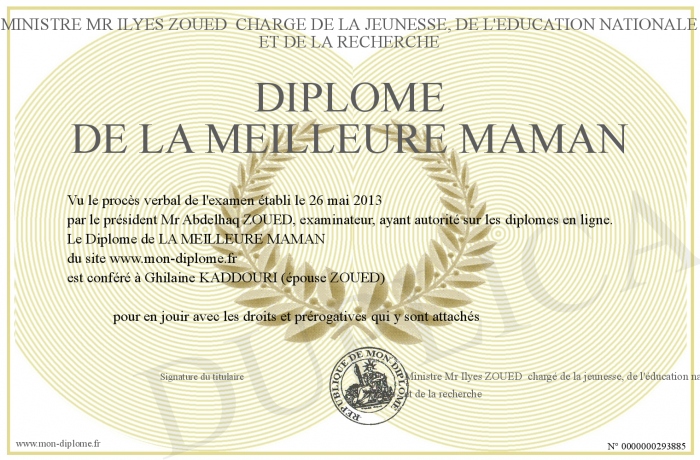 Envoyez par email votre Diplôme de LA MEILLEURE MAMAN personalisé