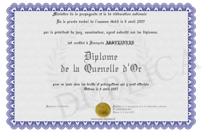 Envoyez par email votre Diplôme de la Quenelle d'Or personalisé