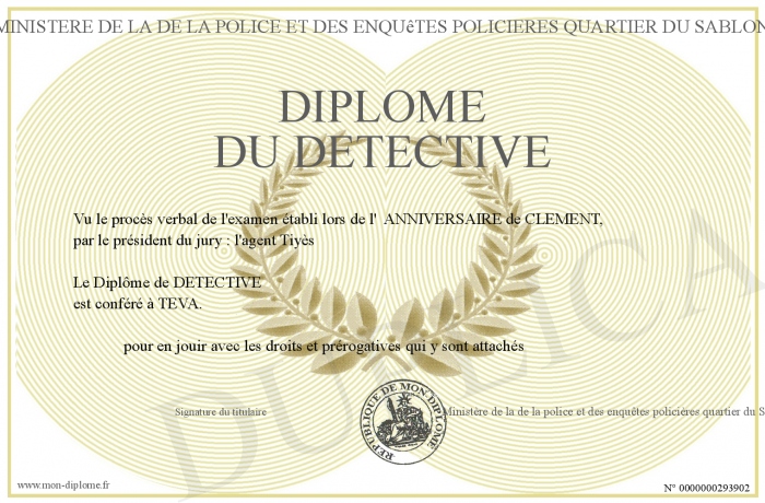 Envoyez par email votre Diplôme du DETECTIVE personalisé