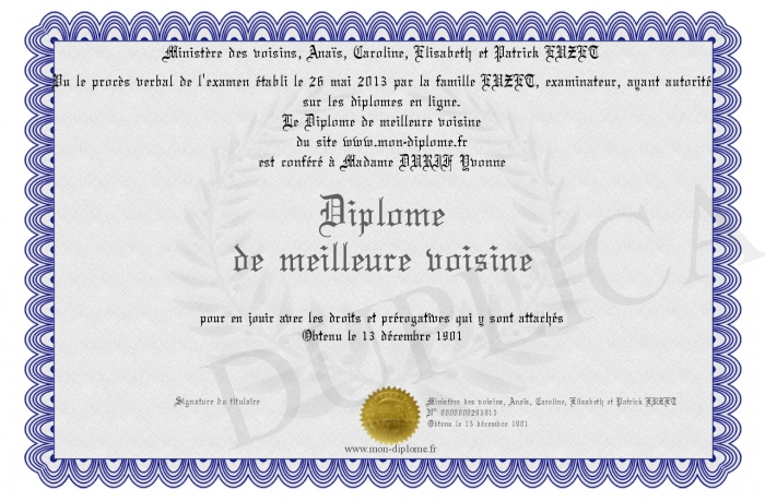 Envoyez par email votre Diplôme de meilleure voisine personalisé